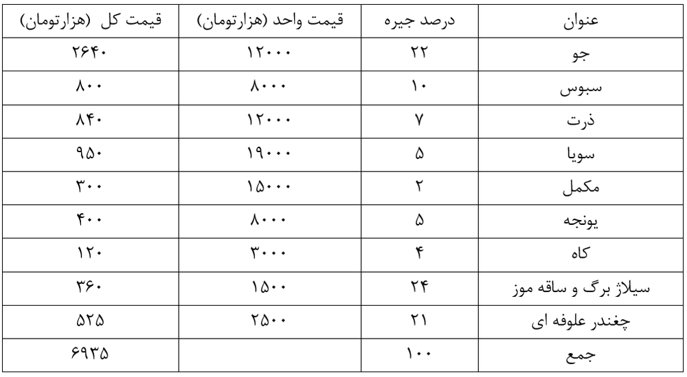 همانگونه که در جدول زیر مشاهده می گردد میتوان تا 24 درصد جیره از سیلاژ ساقه و برک موز استفاده نمود که در صورت استفاده از این محصول میتوان یک خوراک کامل با قیمت 6900 تومان برای مصرف دام تهیه نمود