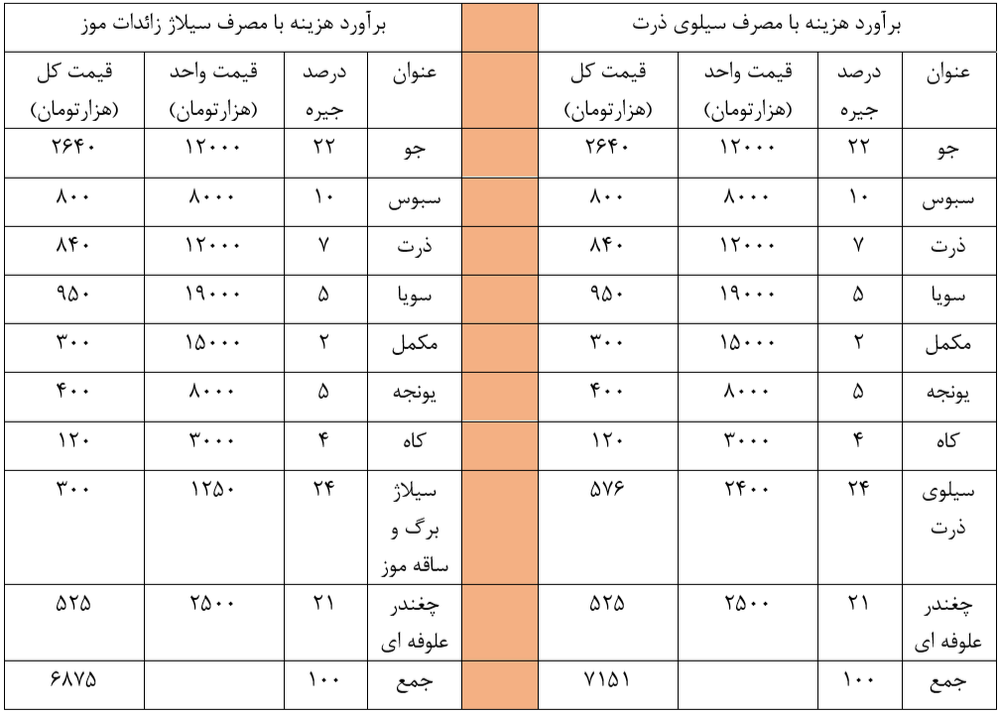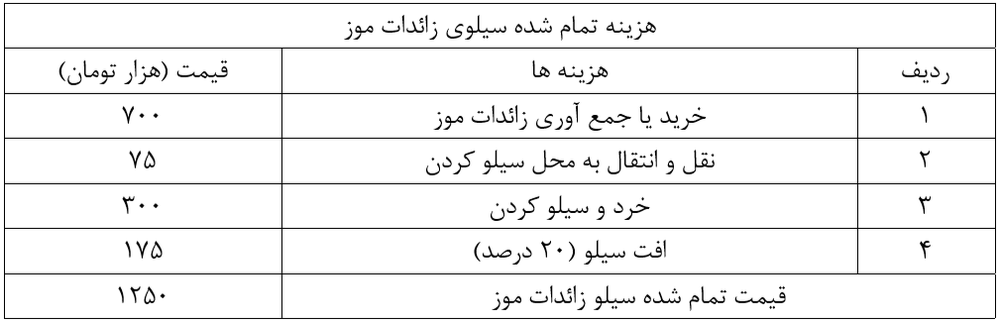 همانگونه که در جدول زیر مشاهده می گردد هزینه تمام شده سیلوی موز 1275 تومان می باشد. هرچند قابلیت جایگزینی صد درصدی بخش علوفه ای جیره را ندارد ولی به هر مقداری در جیره استفاده شود هزینه تمام شده جیره نهایی را کاهش می دهد.