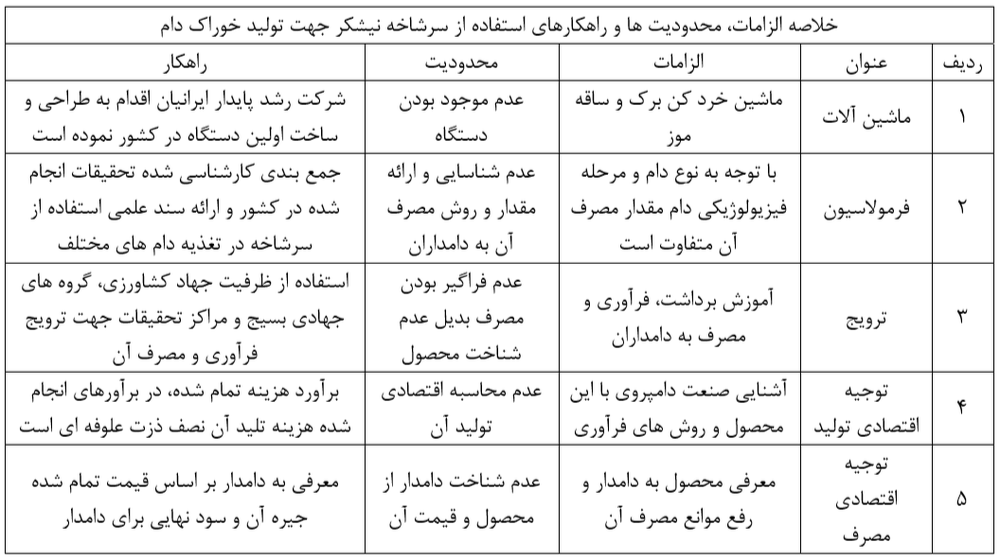 لذا باید از زائدات سیلاژ شده و فرآوری شده با سایر روش های فرآوری در تغذیه انواع دام و در شرایط فیزیولوژیک مختلف استفاده کرد و اثرات تغذیه ای، فیزیولوژیکی، تولیدمثلی و . . . دام های تغذیه شده با این محصولات مانند گوسفند و بز، گاومیش، گاو و شتر را مورد بررسی قرار داد. که نه تنها اثرات منفی نداشه باشد بلکه اثرات مبثت و میزان قابلیت مصرف آن مشخص شده و در اختیار دامداران قرار داده شود. با اینجام این کار این محصول می تواند به عنوان بخشی از علوفه جیره دام ها سبک و سنگین قرار گرفته و علاه بر جبران کمبود علوفه مورد نیاز در استان سیستان و بلوچستان و سایر استان های همجوار، هزینه تولید خوراک دام و در نهایت قیمت گوشت و شیر را به میزان قابل قبولی کاهش داد.